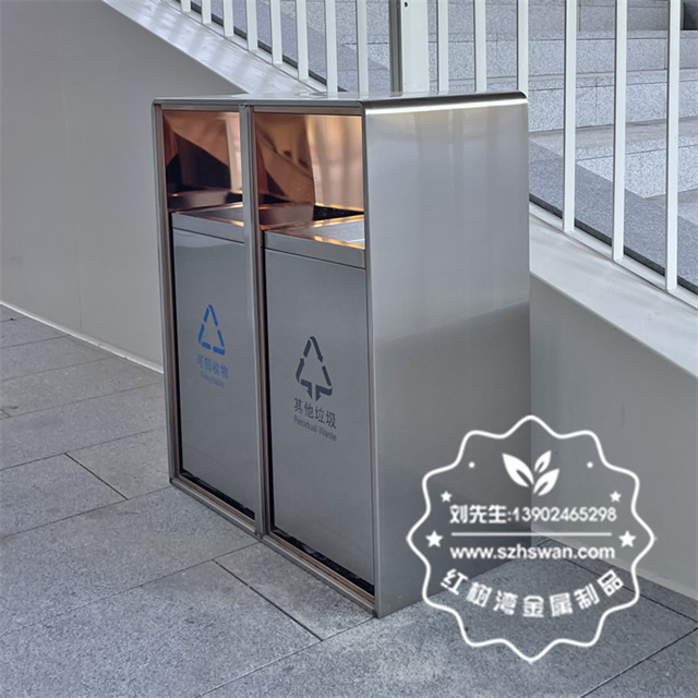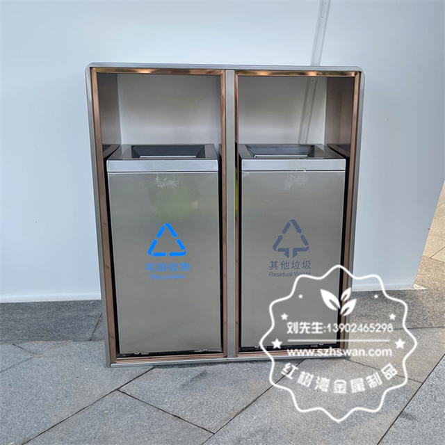 產品材質:廣場滑軌兩連體不銹鋼分類垃圾箱采用201#,202#,304#優質不銹鋼材料模壓成型,堅固耐用;內外表面光潔,減少垃圾殘留,易于清潔;配置鍍鋅板內桶,便于垃圾清倒;