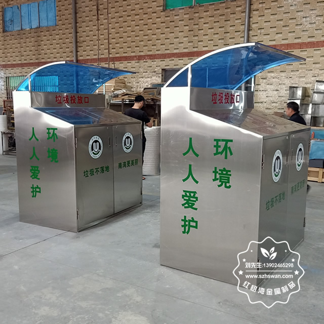 帶雨棚戶外不銹鋼分類垃圾桶采用優質201不銹鋼無縫焊接成型,投口模具沖壓成型,邊角精細打磨拋光圓滑不割手,高檔大氣。