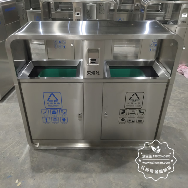 產品材質:戶外街道不銹鋼兩分類垃圾箱采用201#,202#,304#優質不銹鋼材料模壓成型,堅固耐用;內外表面光潔,減少垃圾殘留,易于清潔;配置鍍鋅板內桶,便于垃圾清倒;