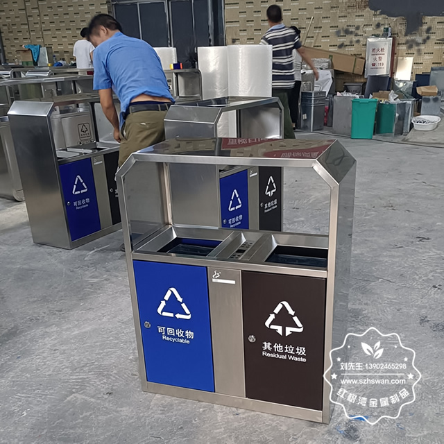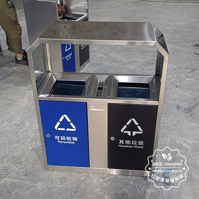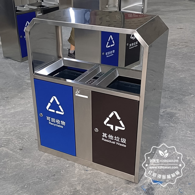 產品材質:戶外道路方形不銹鋼兩分類果皮箱采用201#,202#,304#優質不銹鋼材料模壓成型,堅固耐用;內外表面光潔,減少垃圾殘留,易于清潔;配置鍍鋅板內桶,便于垃圾清倒;