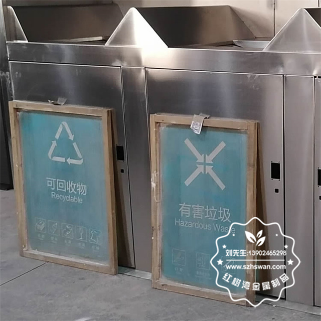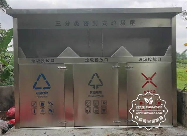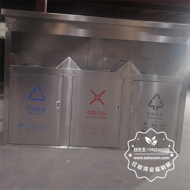 產品材質:戶外密閉式三連體不銹鋼分類垃圾屋采用201#,202#,304#優質不銹鋼材料模壓成型,堅固耐用;內外表面光潔,減少垃圾殘留,易于清潔;配置鍍鋅板內桶,便于垃圾清倒;