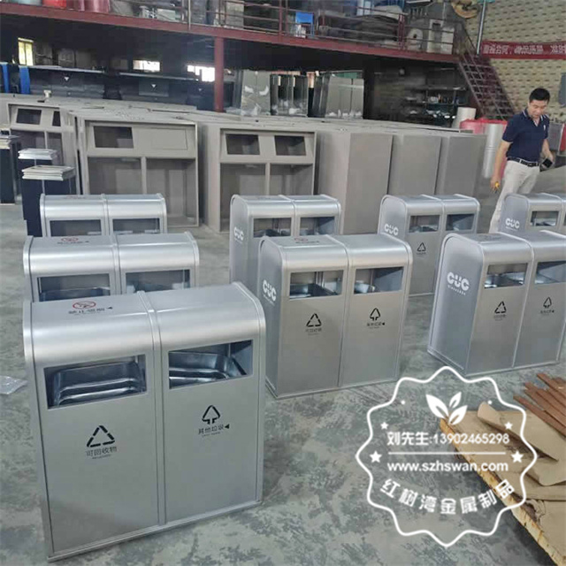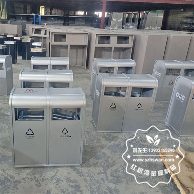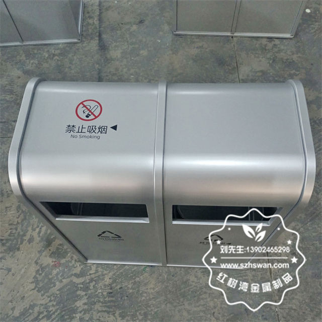 產品材質:戶外公園景區兩連體不銹鋼分類垃圾桶采用201#,202#,304#優質不銹鋼材料模壓成型,堅固耐用;內外表面光潔,減少垃圾殘留,易于清潔;配置鍍鋅板內桶,便于垃圾清倒;