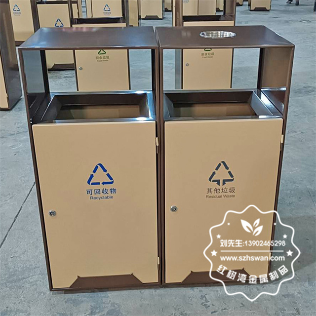 產品材質:戶外公園景區組合式分類不銹鋼垃圾桶采用201#,202#,304#優質不銹鋼材料模壓成型,堅固耐用;內外表面光潔,減少垃圾殘留,易于清潔;配置鍍鋅板內桶,便于垃圾清倒;