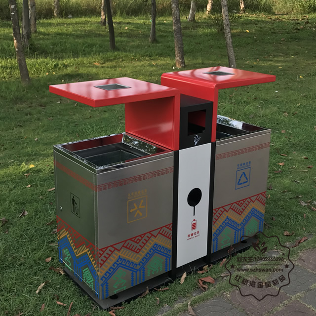 產品材質:創意UV打印戶外分類不銹鋼垃圾桶采用201#,202#,304#優質不銹鋼材料模壓成型,堅固耐用;內外表面光潔,減少垃圾殘留,易于清潔;配置鍍鋅板內桶,便于垃圾清倒;