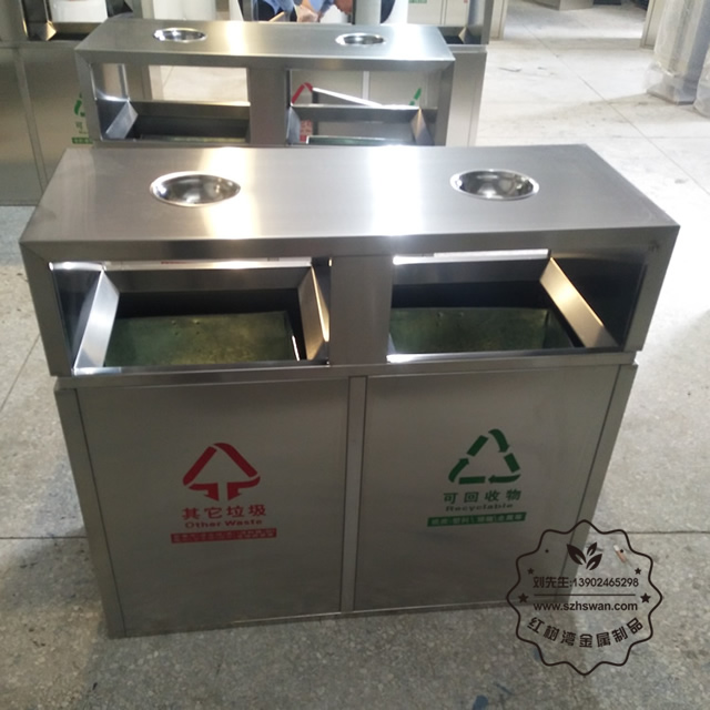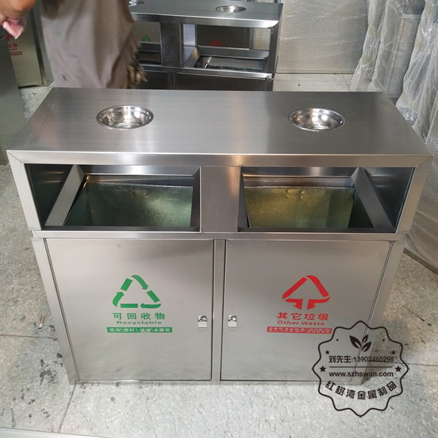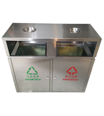 雙煙灰缸戶外兩分類不銹鋼垃圾桶采用優(yōu)質(zhì)201不銹鋼無(wú)縫焊接成型,投口模具沖壓成型,邊角精細(xì)打磨拋光圓滑不割手,高檔大氣。