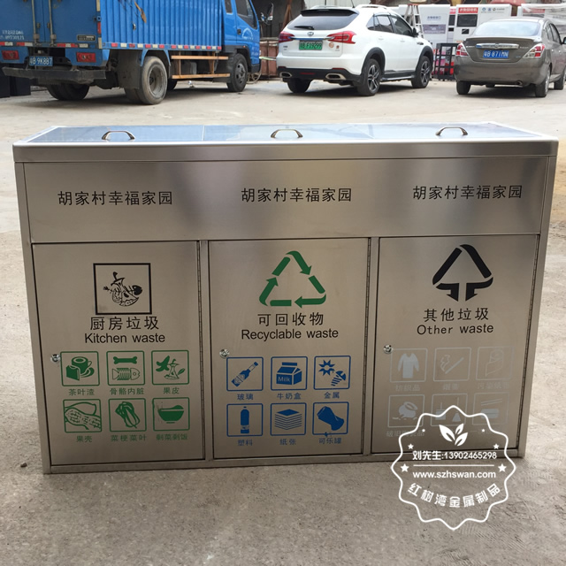 產品材質:社區有蓋三分類戶外分類垃圾桶采用201#,202#,304#優質不銹鋼材料模壓成型,堅固耐用;內外表面光潔,減少垃圾殘留,易于清潔;配置鍍鋅板內桶,便于垃圾清倒;