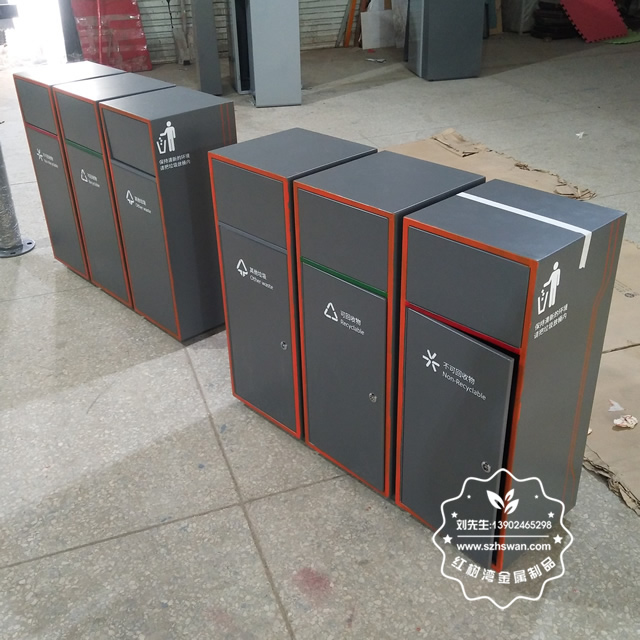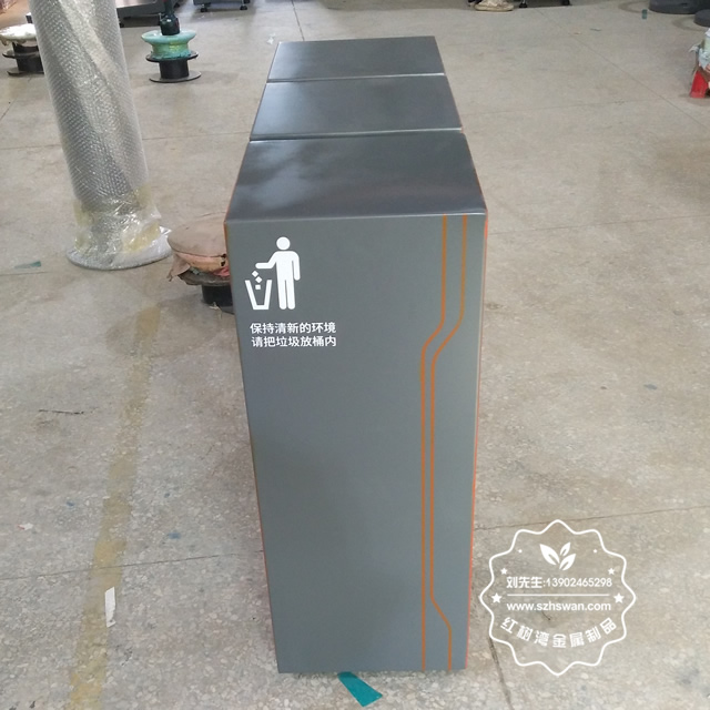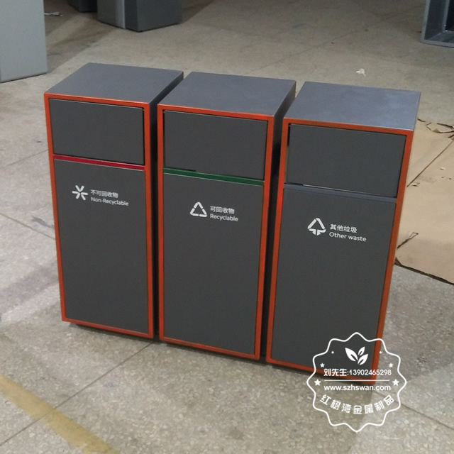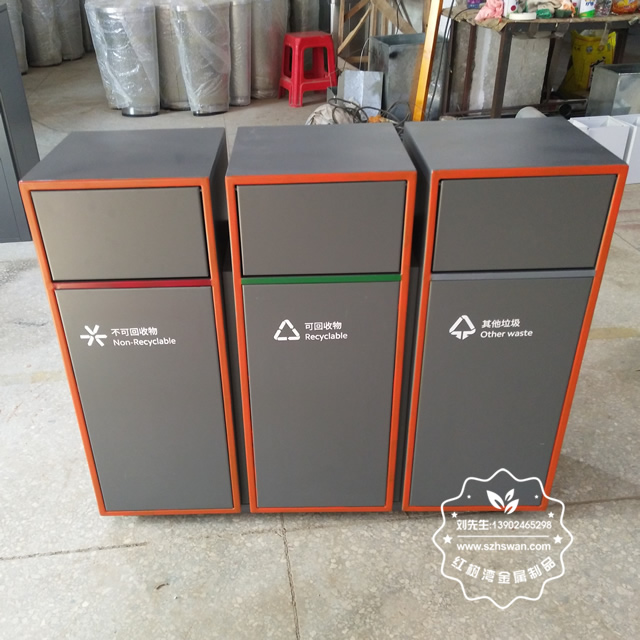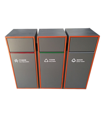產品材質:戶外三分類組合式不銹鋼垃圾箱采用201#,202#,304#優質不銹鋼材料模壓成型,堅固耐用;內外表面光潔,減少垃圾殘留,易于清潔;配置鍍鋅板內桶,便于垃圾清倒;