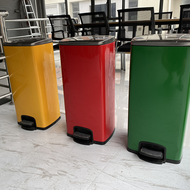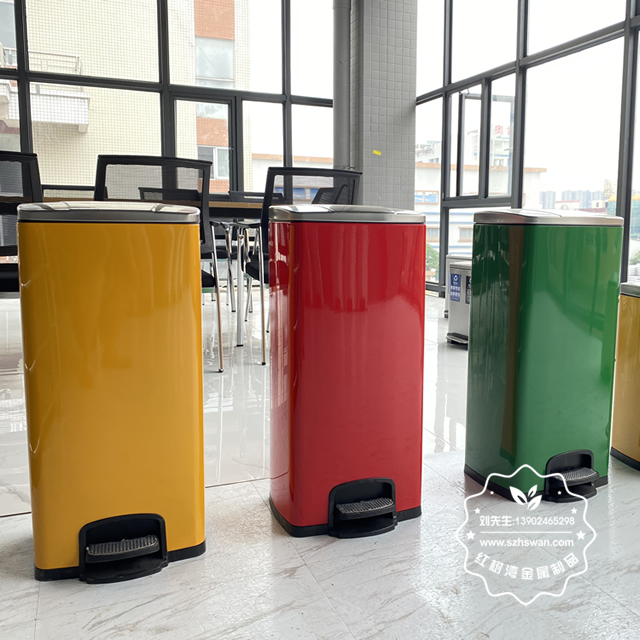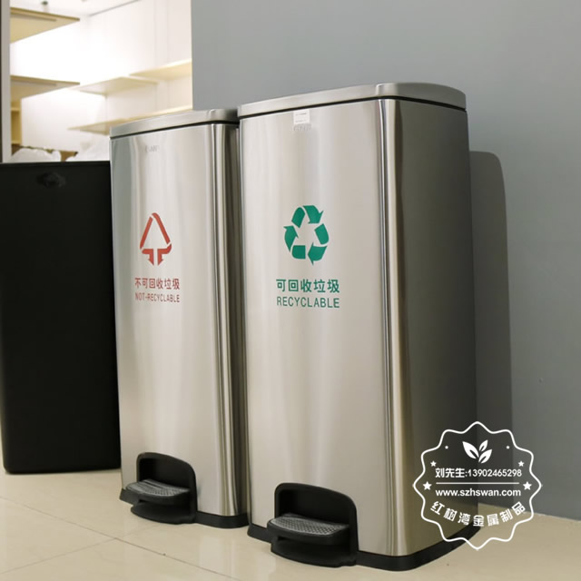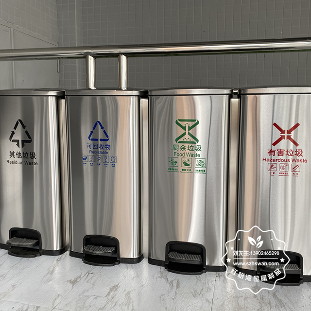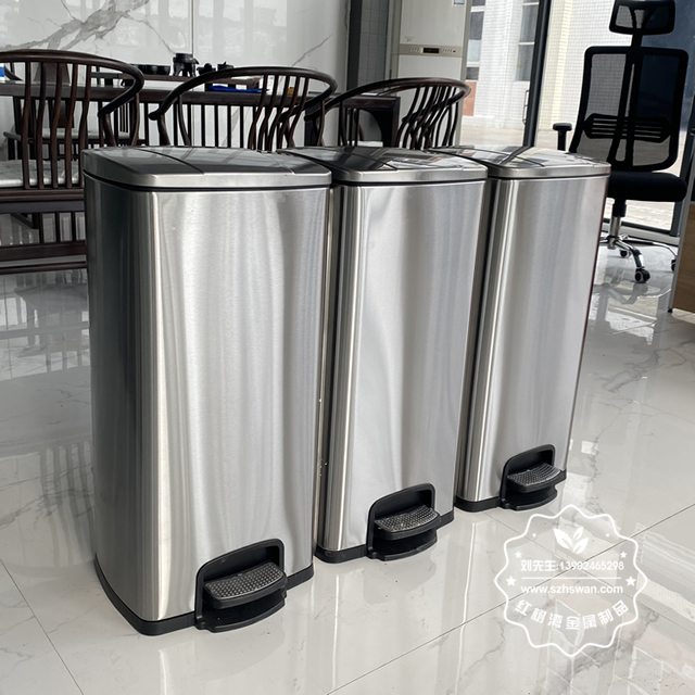 產品材質:不銹鋼腳踏式垃圾桶利用杠桿原理,由外筒、內筒、筒蓋、支架、連桿、踏桿等部分組成。采用201#,202#,304#優質不銹鋼材料模壓成型,產品內外光潔高檔大氣;