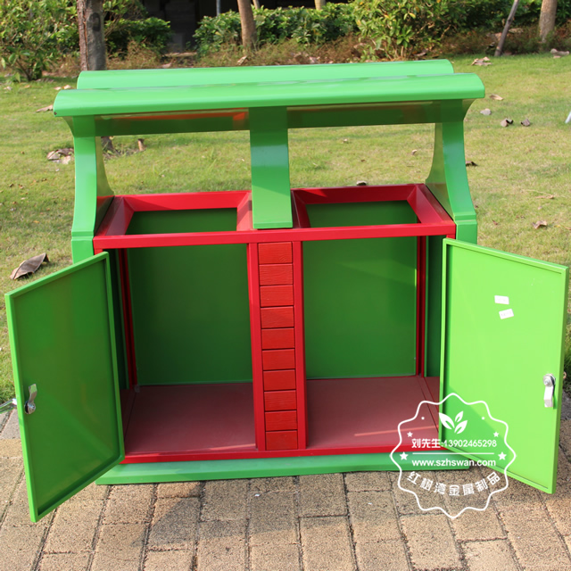 產品材質:戶外園林雙分類鋼制垃圾箱表面經過除油、噴砂防銹處理后,再進行酸洗磷化處理;表面清理后整體進行靜電噴涂或烤漆處理,靜電噴涂是經過流水線高溫固化爐固化后再出爐冷卻,漆面色澤耐久,防腐防銹;