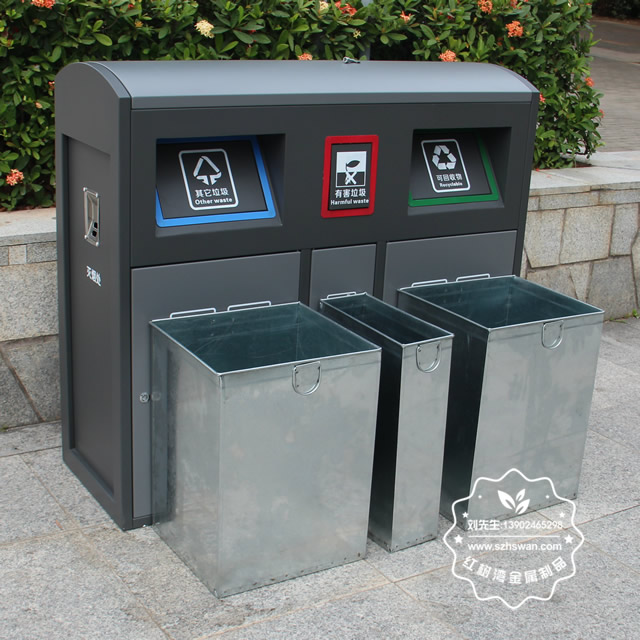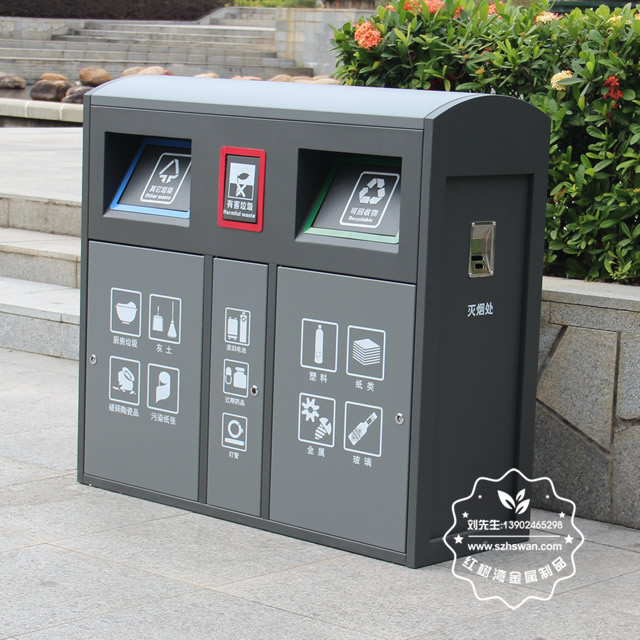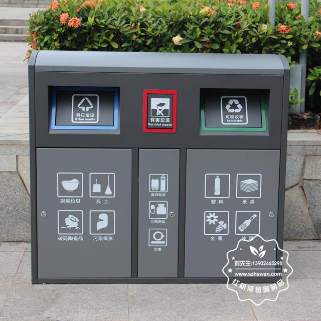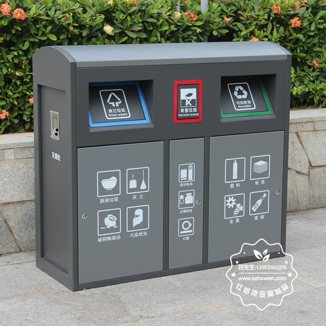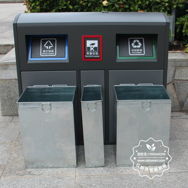 產品材質:戶外三分類鋼板垃圾箱表面經過除油、噴砂防銹處理后,再進行酸洗磷化處理;表面清理后整體進行靜電噴涂或烤漆處理,靜電噴涂是經過流水線高溫固化爐固化后再出爐冷卻,漆面色澤耐久,防腐防銹;