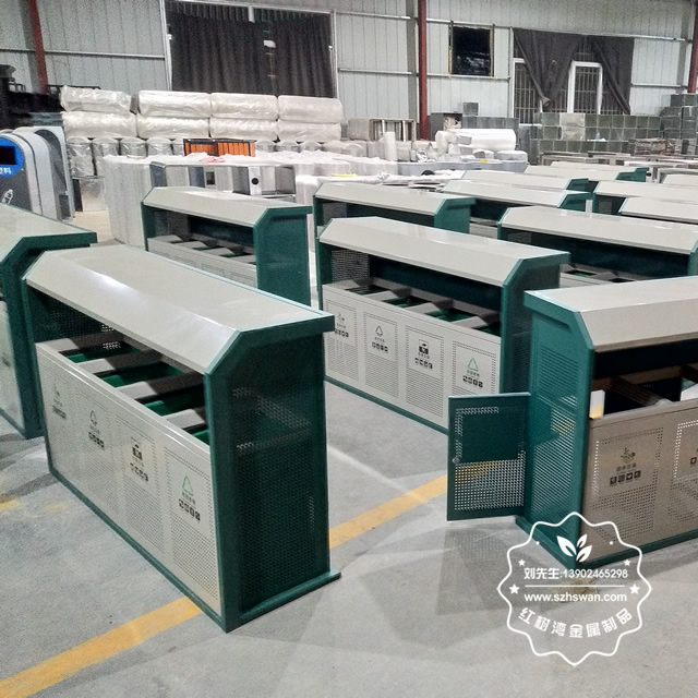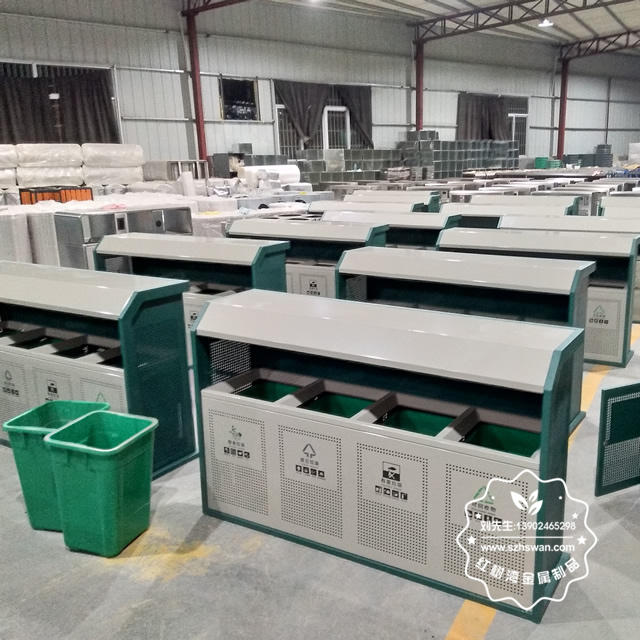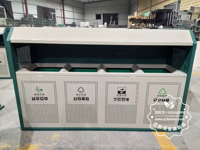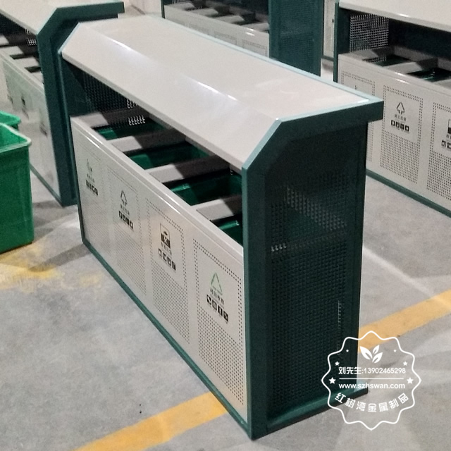 產品材質:市政街道鋼板四分類垃圾箱表面經過除油、噴砂防銹處理后,再進行酸洗磷化處理;表面清理后整體進行靜電噴涂或烤漆處理,靜電噴涂是經過流水線高溫固化爐固化后再出爐冷卻,漆面色澤耐久,防腐防銹;
