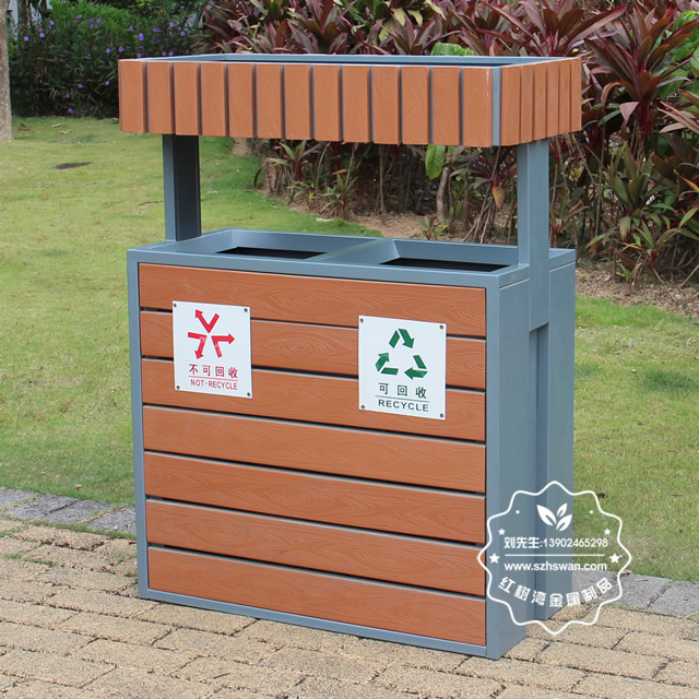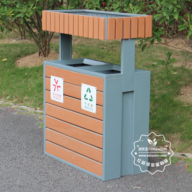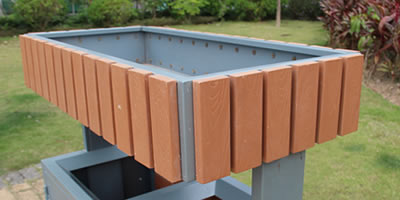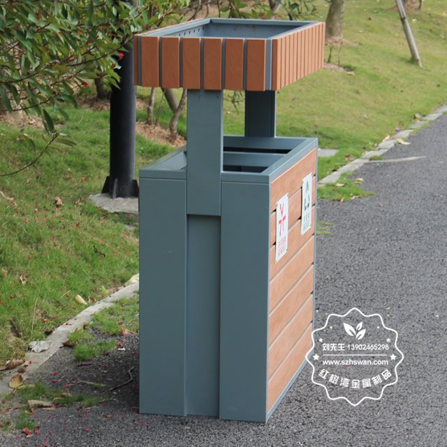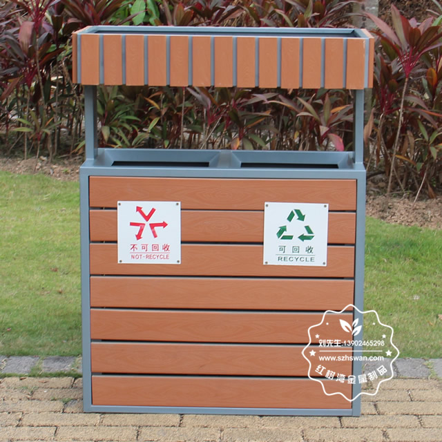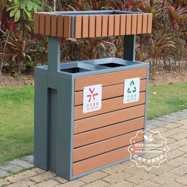 產品材質:公園綠化花箱鋼木分類垃圾桶鋼木部分可選用優質進口山樟木、防腐木或塑木,經防腐烘干處理后加工成型。桶身框架采用冷軋鋼板加工,表面經酸洗磷化噴塑處理組裝而成,使其戶外耐候持久,防腐防蛀不變形等優點;