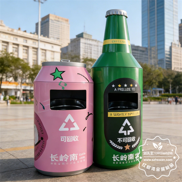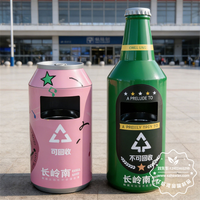 產品材質:戶外啤酒瓶造型鍍鋅板鐵皮垃圾桶采用優質冷軋鋼經除油-除銹-表調-磷化處理后,表面采用汽車靜電粉末經過180~220℃高溫烤漆,使粉末熔化黏附在金屬表面,雙層防銹,漆面色澤耐久;
