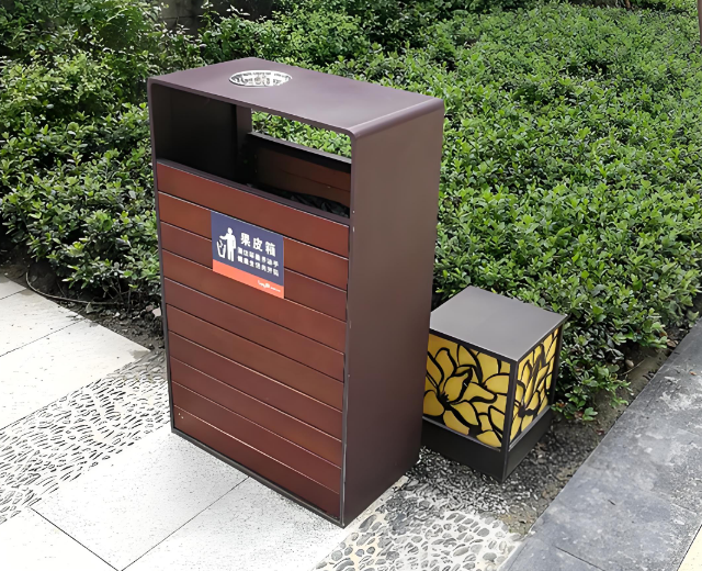 其材質(zhì)上鋼與木的完美結(jié)合,更是一大亮點(diǎn)。主體框架采用堅(jiān)固的鋼材打造,確保了垃圾桶擁有出色的穩(wěn)定性和承重能力,能夠承受日常使用中的各種碰撞和壓力,不易變形損壞。同時(shí),鋼材表面經(jīng)過(guò)特殊處理,具有良好的防銹、防腐性能,無(wú)論是面對(duì)烈日的炙烤,還是雨水的沖刷,都能長(zhǎng)久保持如新。而垃圾桶的側(cè)板部分,則選用了優(yōu)質(zhì)木材,木材的天然質(zhì)感和溫暖色調(diào),為冰冷的鋼材增添了一份自然與溫馨。木材的紋理獨(dú)特,每一塊都散發(fā)著自然的氣息,仿佛在訴說(shuō)著大自然的故事。這種鋼木結(jié)合的設(shè)計(jì),既兼顧了實(shí)用性,又為小區(qū)增添了一份別樣的藝術(shù)氛圍。