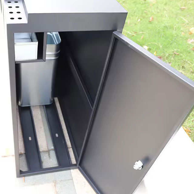 這款垃圾桶采用經典的黑色噴粉工藝,深邃的黑色外觀散發著神秘而高雅的氣質,與各種戶外環境都能完美融合。無論是在繁華都市的街頭,還是寧靜的自然景區,它都不會顯得突兀,反而能為周邊環境增添一份現代時尚感。噴粉工藝不僅提升了垃圾桶的美觀度,還使其表面具有良好的耐磨性和耐候性,能夠有效抵御戶外惡劣環境的侵蝕,長久保持嶄新的外觀。堅固材質,無懼風吹雨打