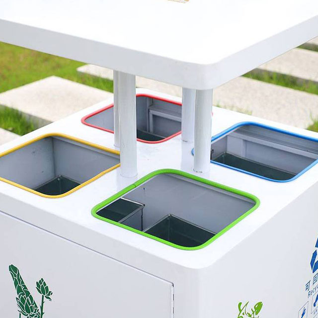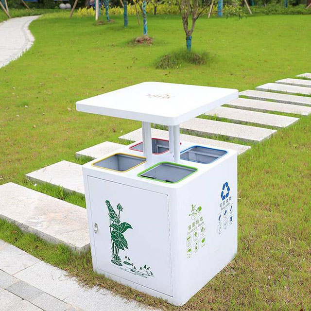 公園作為人員密集的休閑場所,垃圾種類繁多。這款垃圾桶精準劃分為可回收物、有害垃圾、廚余垃圾和其他垃圾四類。可回收物區域鼓勵游客將飲料瓶、紙張等有回收價值的物品進行分類投放,實現資源的再利用;有害垃圾區域則妥善收納廢舊電池、過期藥品等,避免對土壤和水源造成污染;廚余垃圾區域收集游客野餐產生的食物殘渣等;其他垃圾區域收納難以歸類的廢棄物。這樣細致的分類,符合現代環保理念,能最大程度地提高垃圾處理效率,減少對環境的負面影響。