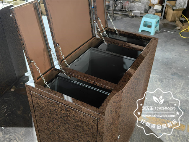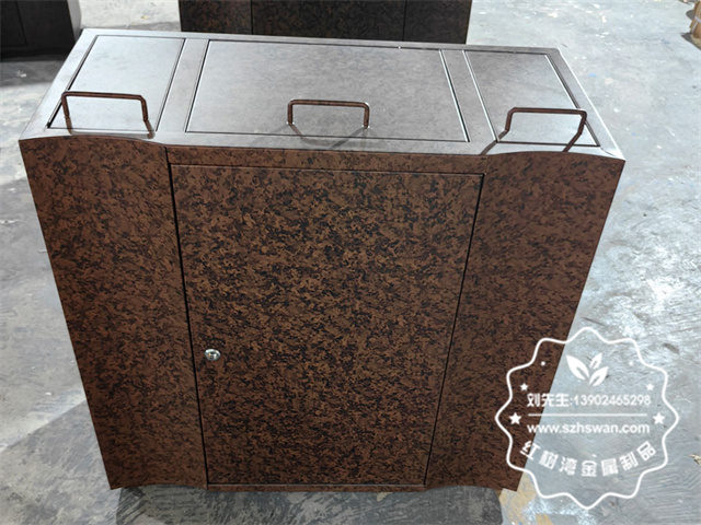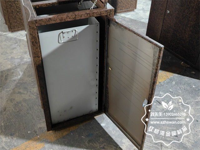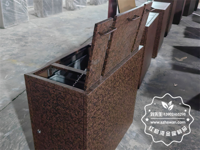 不銹鋼堅實品質:選用高品質的不銹鋼材質,具備超強的耐腐蝕性和耐磨性,能夠承受商業場所高強度的使用頻率和各種復雜環境,即使在人流量大、垃圾投放頻繁的情況下,也不易生銹、變形,大大降低了維護和更換成本。  逼真大理石紋工藝:運用先進的表面處理技術,在不銹鋼表面精準轉印出逼真的大理石紋理。這種工藝不僅賦予垃圾箱獨特的視覺效果,還增強了表面的硬度和耐磨性,確保紋理長期保持清晰,不褪色、不磨損。三、精細制作流程