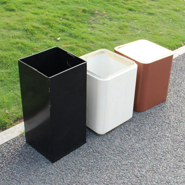 產品材質:電鍍仿木紋室內方形不銹鋼果皮箱采用201#,202#,304#優質不銹鋼材料模壓成型,堅固耐用;內外表面光潔,減少垃圾殘留,易于清潔;配置鍍鋅板內桶,便于垃圾清倒;