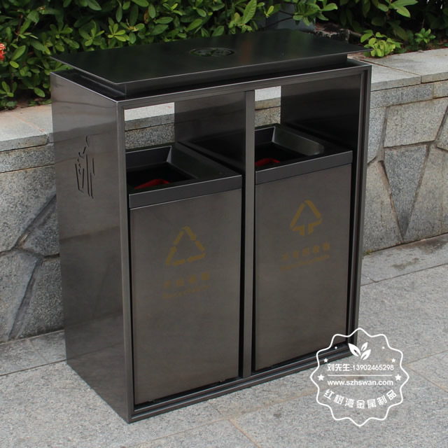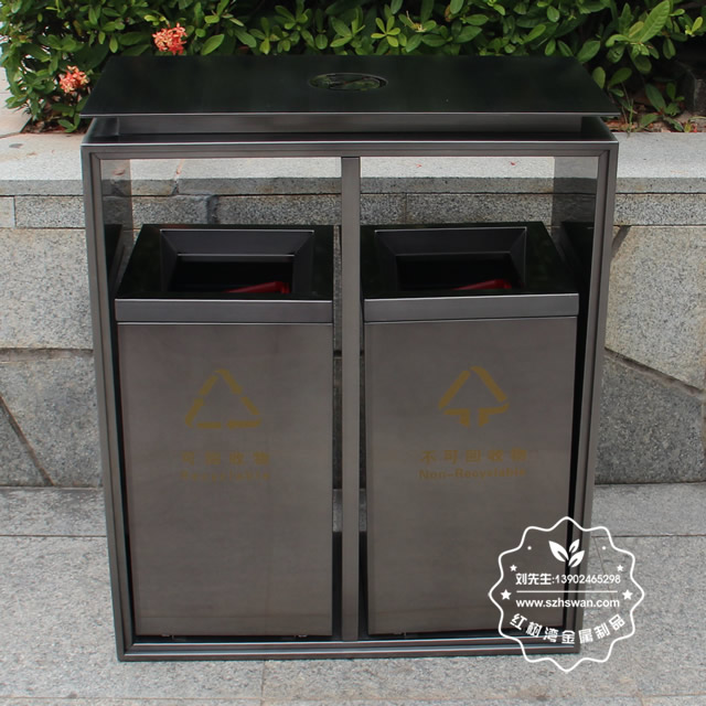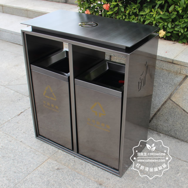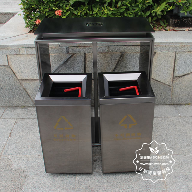 電梯口兩分類不銹鋼果皮箱采用優(yōu)質201不銹鋼無縫焊接成型,投口模具沖壓成型,邊角精細打磨拋光圓滑不割手,高檔大氣。