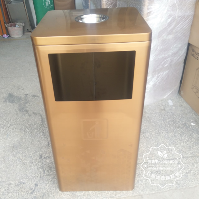 產品材質:腐刻電鍍土豪金不銹鋼垃圾桶采用201#,202#,304#優質不銹鋼材料模壓成型,堅固耐用;內外表面光潔,減少垃圾殘留,易于清潔;配置鍍鋅板內桶,便于垃圾清倒;