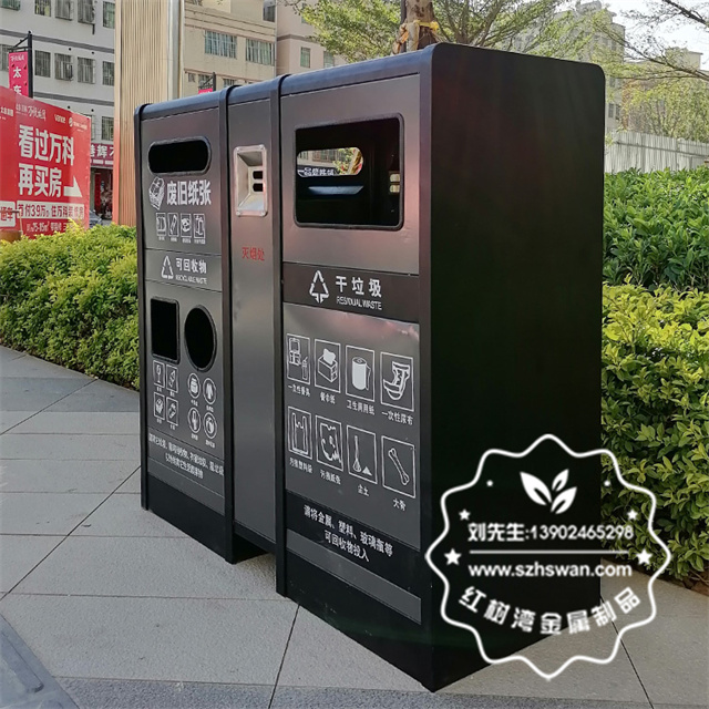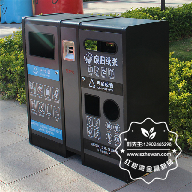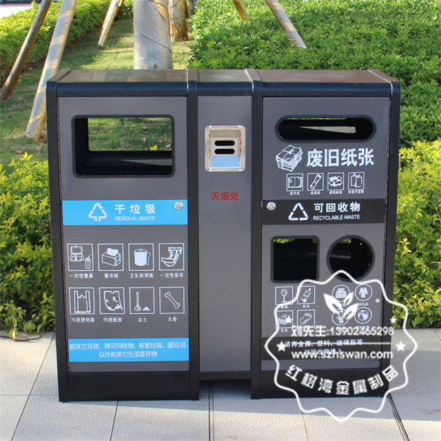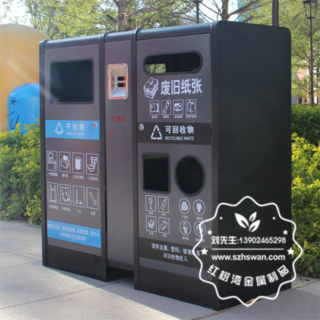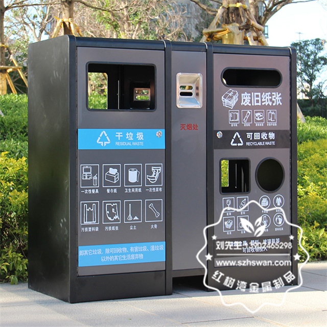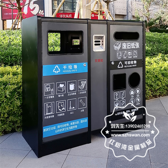 產品材質:室內戶外寫字樓不銹鋼分類果皮箱采用201#,202#,304#優質不銹鋼材料模壓成型,堅固耐用;內外表面光潔,減少垃圾殘留,易于清潔;配置鍍鋅板內桶,便于垃圾清倒;