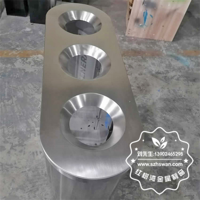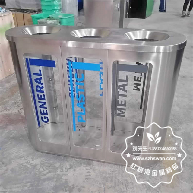 產品材質:室內地鐵站環保不銹鋼三分類垃圾桶采用201#,202#,304#優質不銹鋼材料模壓成型,堅固耐用;內外表面光潔,減少垃圾殘留,易于清潔;配置鍍鋅板內桶,便于垃圾清倒;