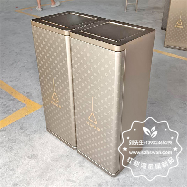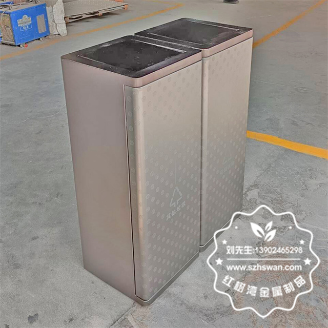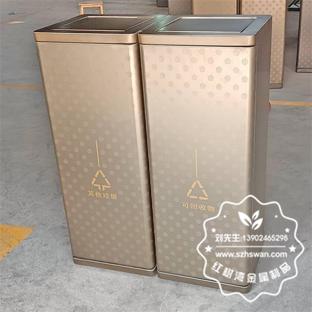 室內搖擺蓋電鍍腐刻不銹鋼分類垃圾桶采用優質304不銹鋼無縫焊接成型,投口模具沖壓成型,邊角精細打磨拋光圓滑不割手,高檔大氣。